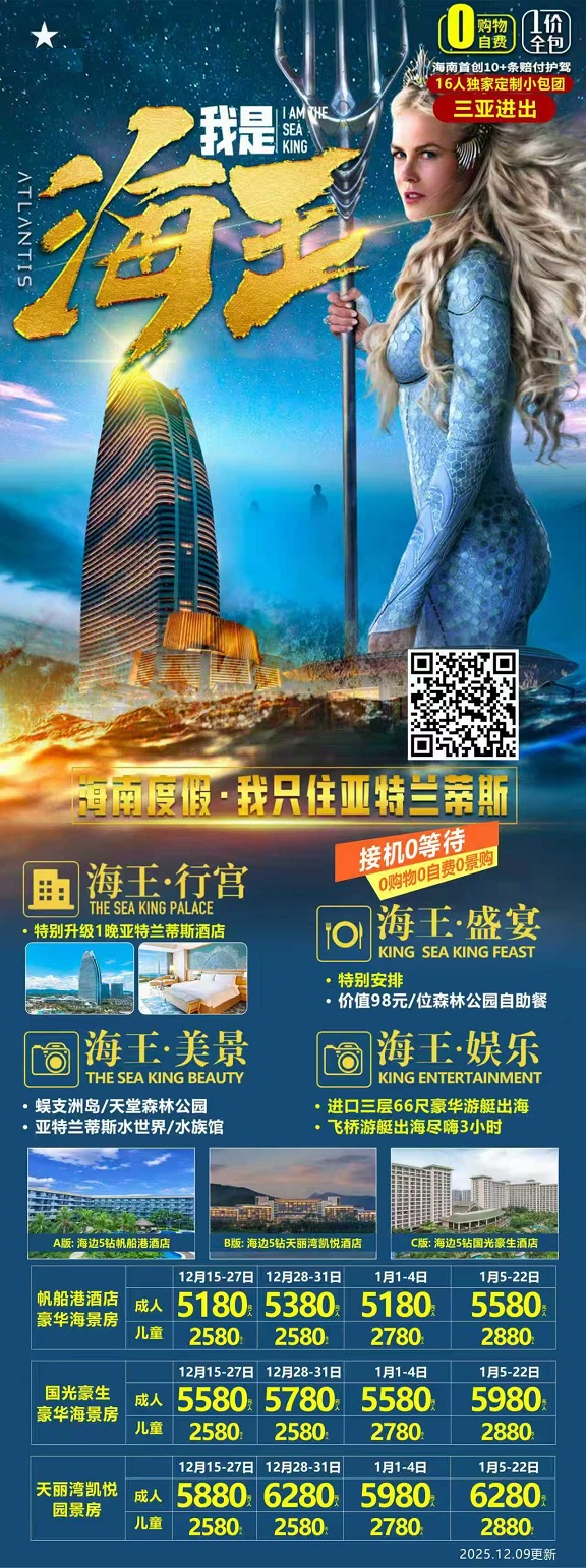 线路名称:12月-1月【我是海王:海南三亚双飞5日游 0购物0自费 升级1晚亚特兰蒂斯酒店】5180元起