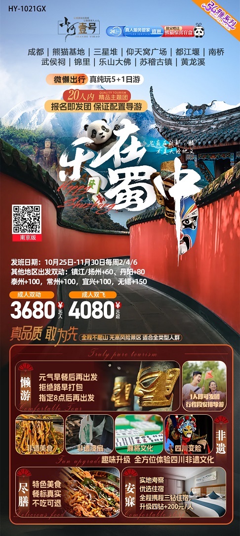 成都市区·熊猫基地·三星堆·都江堰·南桥·武侯祠·锦里·乐山大佛·黄龙溪古镇.仰天窝广场·川剧变脸·苏稽古镇·张公桥美食街·宽窄巷子·奎星楼美食街6日游