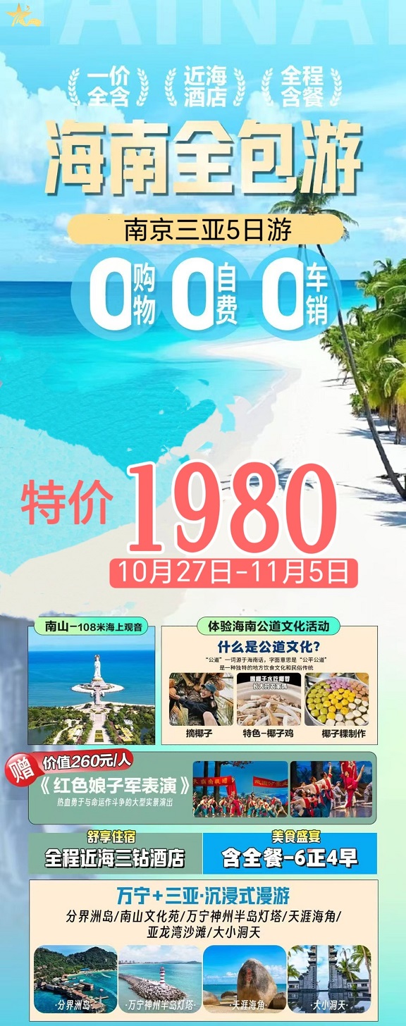 当前位置:首页 >> 国内长线 >> 10-11月【海南全包游:海南三亚双飞5日游 0购物0自费 近海三钻酒店】1980元起