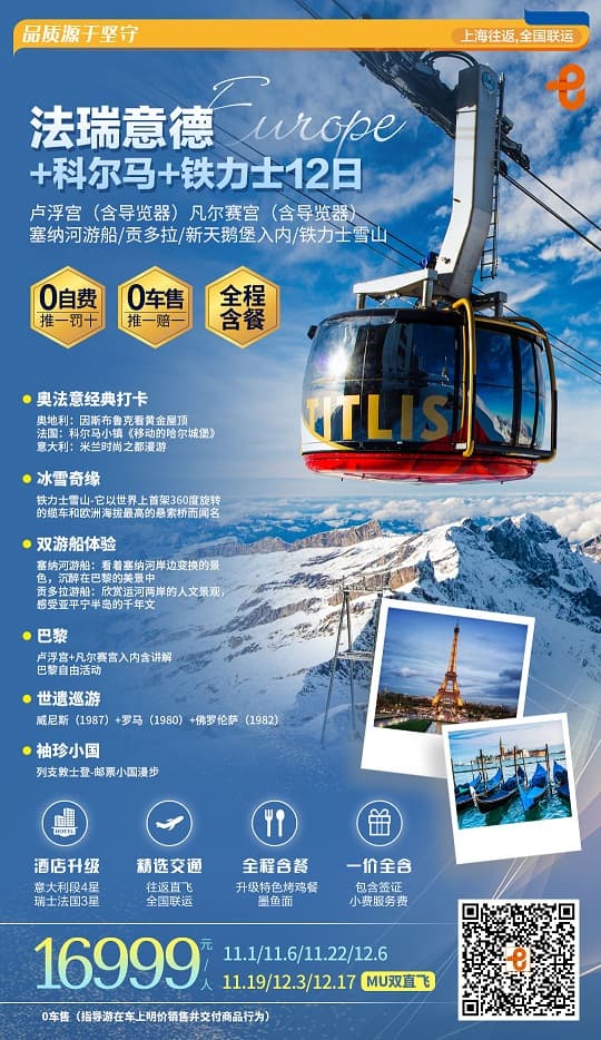 【推一罚十】惠品德国+法国+瑞士+意大利+科尔马+铁力士 12天9晚 MUC-CDG(3 钻)全餐