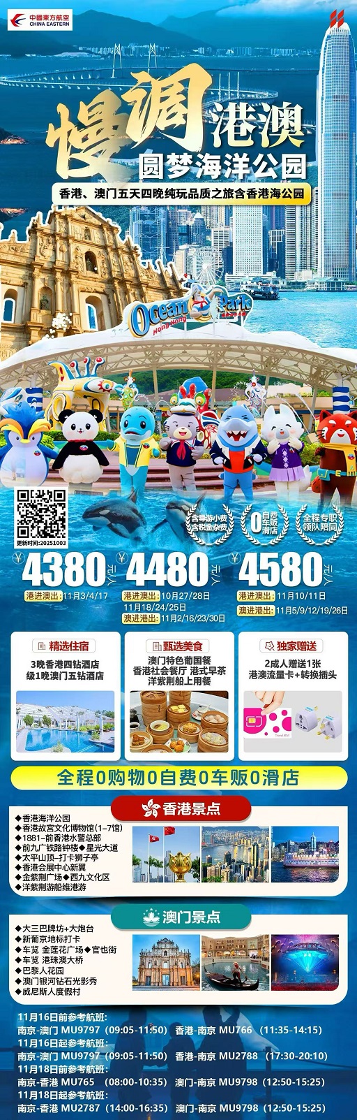 南京-香港, 澳门-南京往返机票含税 、香港-澳门穿梭巴士 、港澳当地空调旅游车, 保证一人一正座;