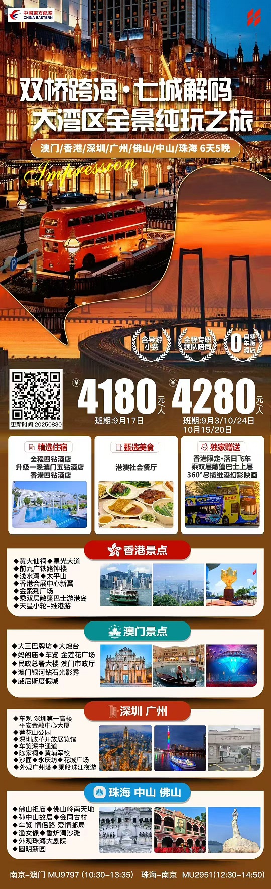 南京-澳门 、珠海-南京往返机票含税, 澳门-香港港珠澳穿梭巴士; 当地空调旅游车, 保证一人一正座;