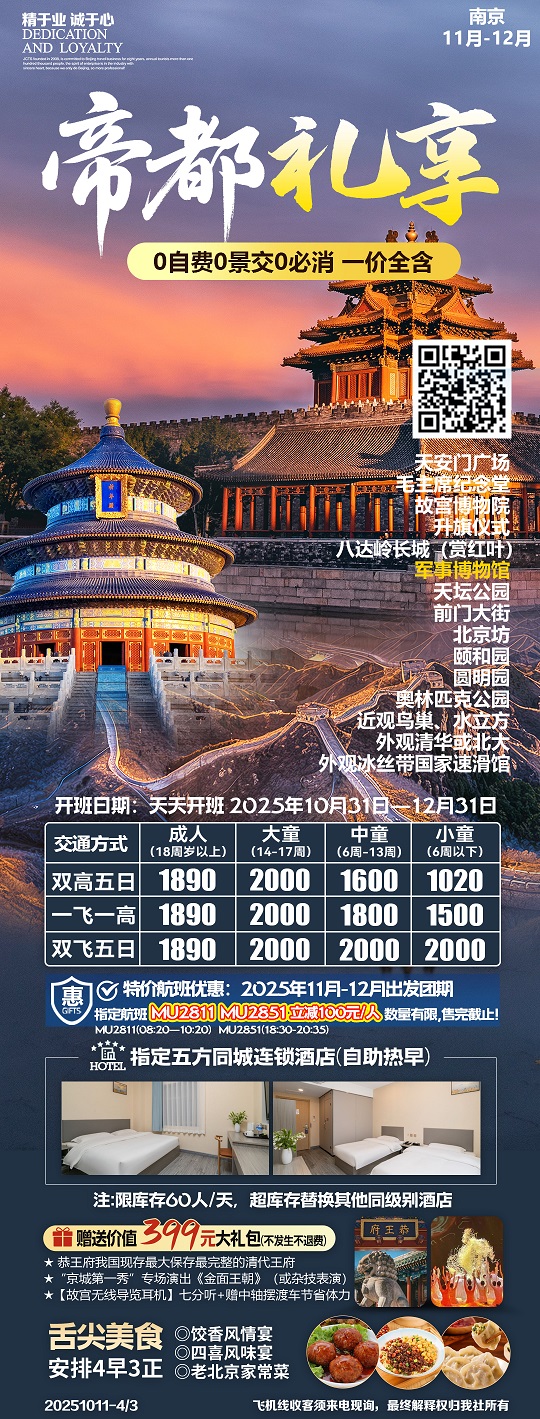 特殊说明:当天参团限当天6:30前到京,若因火车晚点延误,导致部分景区无法正常参观,我公司不再另行安排,未产生费用在京导游现退客人。