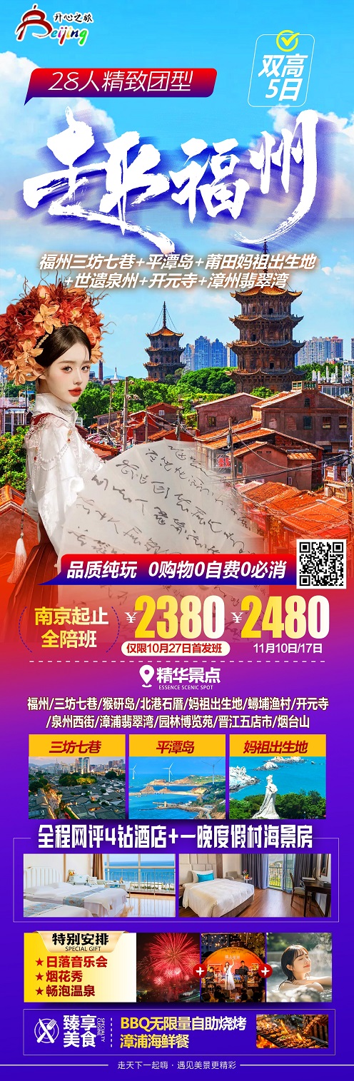 线路名称:10月【福建:福州 平潭岛 白水洋 霞浦 太姥山 泉州 东山岛】线路及报价