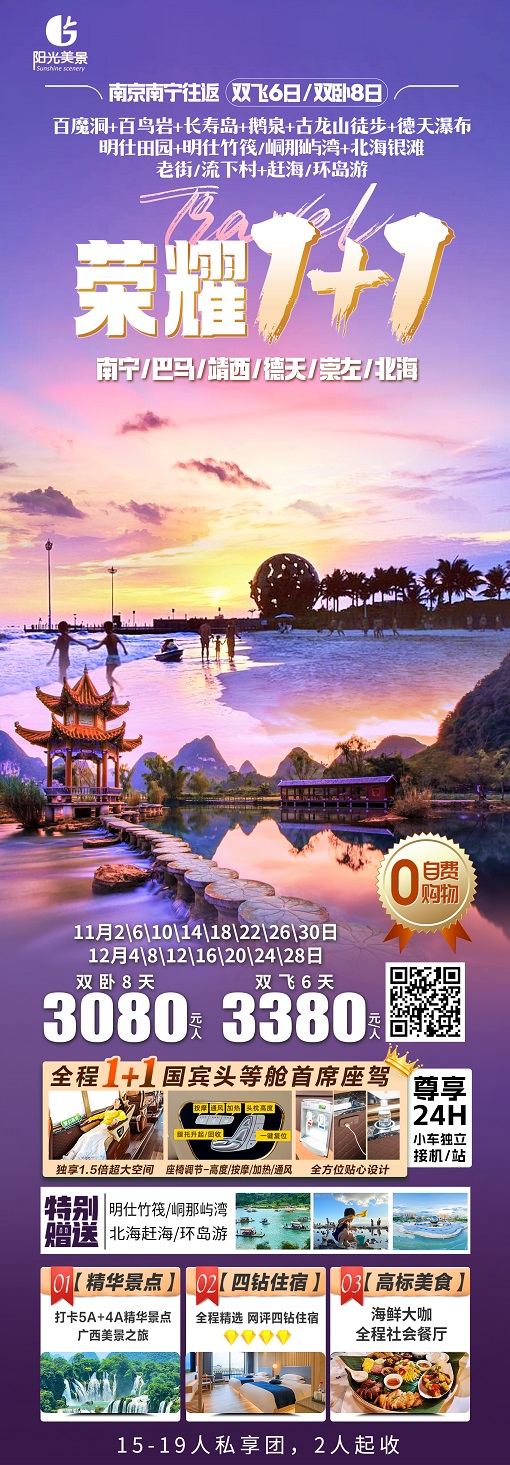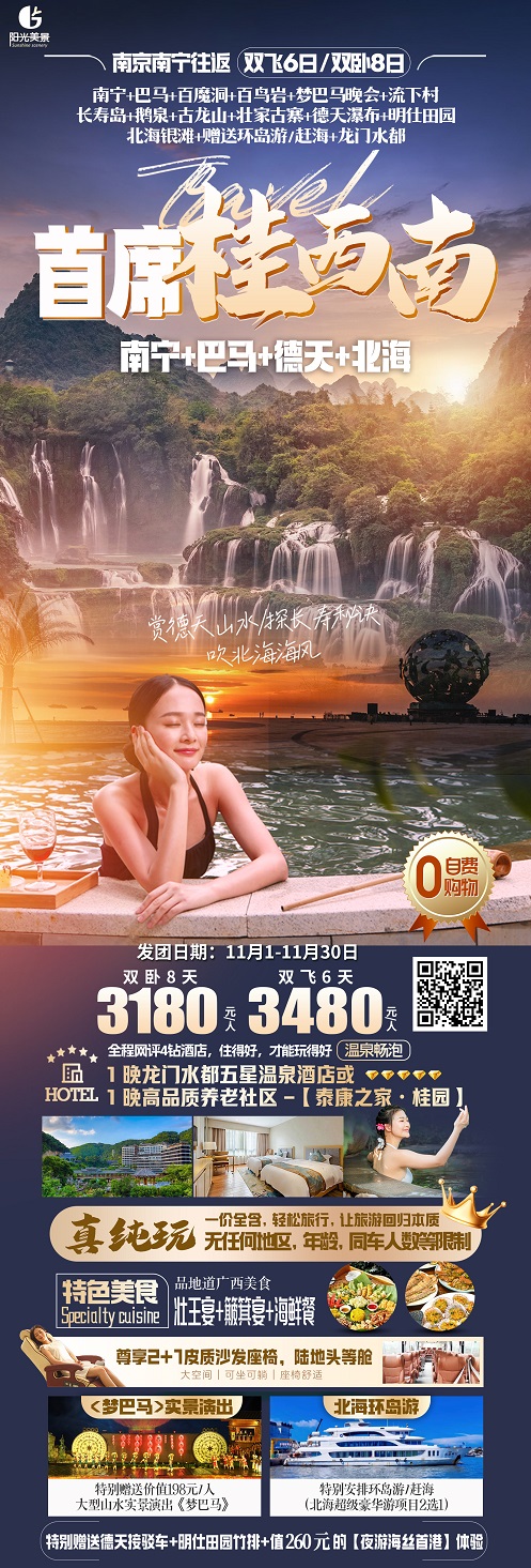 当前位置:首页 >> 国内长线 >> 11月【广西:南宁 北海 德天瀑布 巴马 涠洲岛 柳州】线路及报价