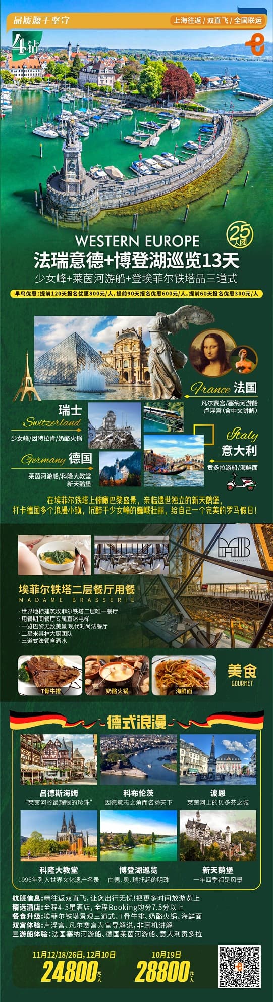 精品德国+法国+瑞士+意大利+博登湖巡览 13 天 10 晚MXP-FRA(4 钻)
