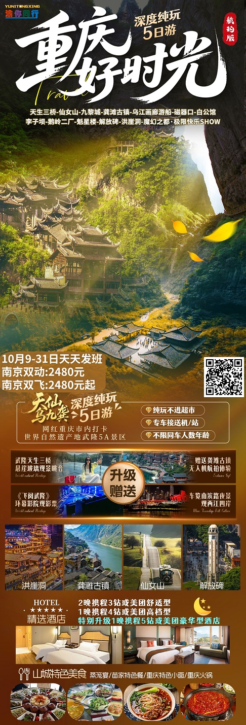 【奢享重庆:重庆武隆 龙水峡地缝 仙女山 乌江画廊 重庆市内纯玩5日游】.行程