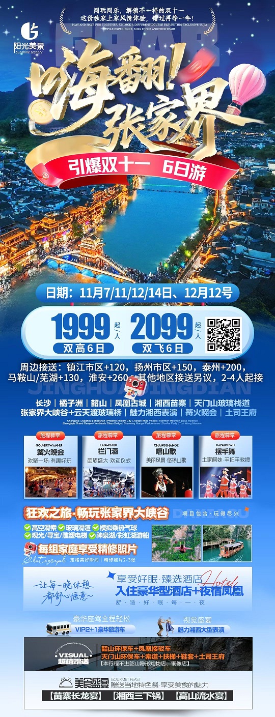 亮点 1 :双 11 锁定这趟湘西游 !橘子洲→韶山→凤凰→张家界打卡 ,双玻璃桥踏云 ,篝火晚会喝 拦门酒 ,5 大体验一次拉满 ,性价比绝了 !