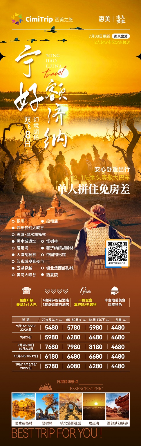 【全景额济纳:银川+额济纳胡杨林双卧9日游 0购物0自费】.行程