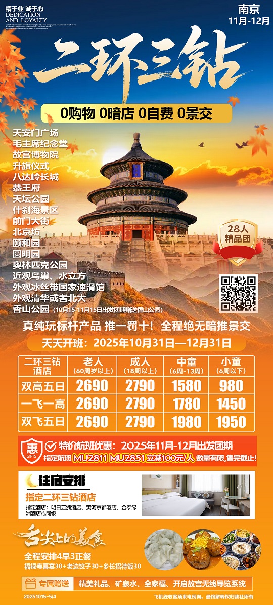 【二环三钻:北京5日游 0购物0自费 二环三钻酒店 28人精品团】.行程