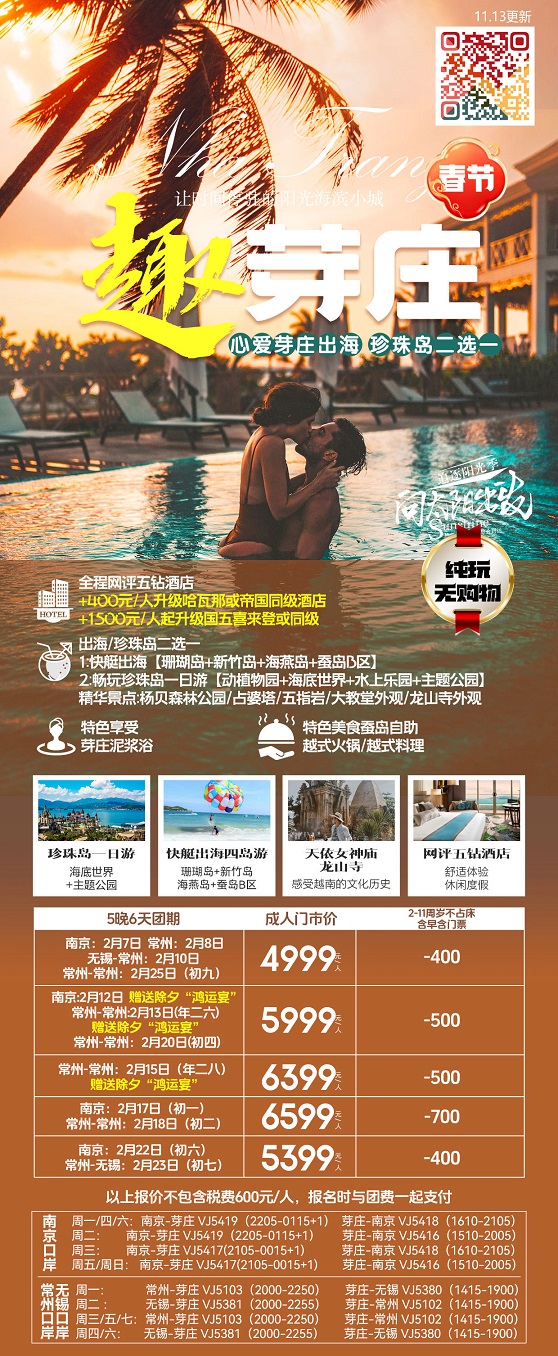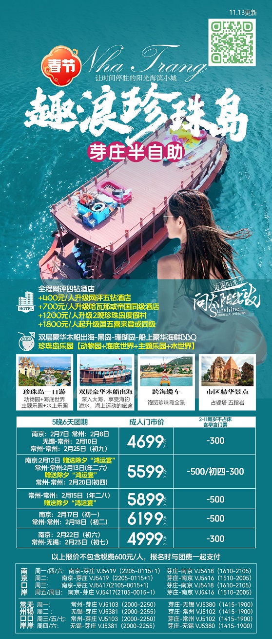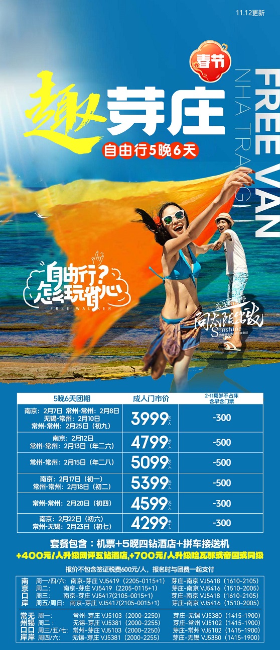 线路名称:春节【越南芽庄-南京直飞】2月7日-2月23日报价
