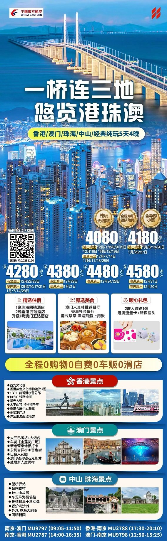 一桥连三地 悠览港珠澳-纯玩品质5天4晚行程(南京起止 澳进港出MU)