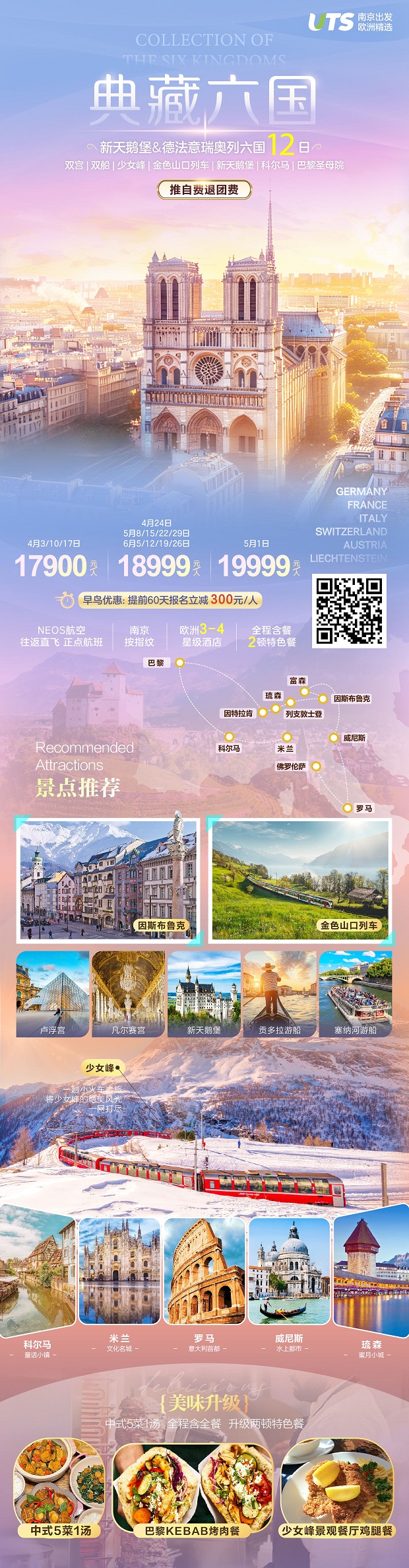 产品亮点 | · 欧洲屋脊:搭乘高人气登山齿轨火车,登上少女峰,一路苍翠与白雪相映,站在欧洲 最高的观景台饱览群山,冰雪世界如梦似幻! ·景观火车:乘坐瑞士大景观列车,金色山口景观列车,将瑞士湖光山色尽收眼底。 · 巴黎双宫:世界三大博物馆之一的【卢浮宫】含导览器 世界五大宫殿之一的【凡尔赛宫】含人工讲解 ·双 游 船 :威尼斯独有的【贡多拉游船】 + “浪漫花都”横贯巴黎的【塞纳河游船】 ·古堡情缘:外观童话城堡新天鹅堡,在山峦云雾中犹如圣洁的白天鹅。 ·独特体验:探访奥地利山城因斯布鲁克,尽享这座中世纪城市的纯净。 · 邮票王国:世界上唯二的双重内陆国列支敦士登。 ·意犹未尽:拥有悠久历史和辉煌古代文明的意大利首都罗马; 意大利语中意为花之都,大诗人徐志摩把它译作“翡冷翠”佛罗伦萨; 意大利闻名于世的浪漫水上都市威尼斯,拥有“ 因水而生,因水而美,因水 而兴”的美誉; 世界时尚艺术中心,世界设计之都,世界历史文化名城米兰。 ·童话小镇: 打卡《中餐厅2》取景地,色彩斑斓的小镇—科尔马,感受宛如童话故事 场景的现实写真! ·世外桃源:邂逅不可抗拒之美,蜜月小镇—琉森 瑞士著名的度假胜地之一,以一年四季风景醉人著称的因特拉肯 ·购物狂欢:巴黎老佛爷百货,尽享买买买的无限乐趣! |