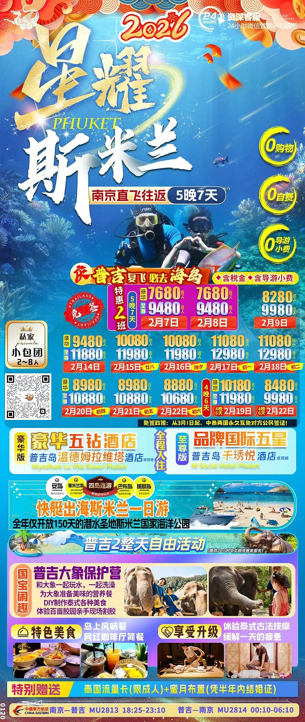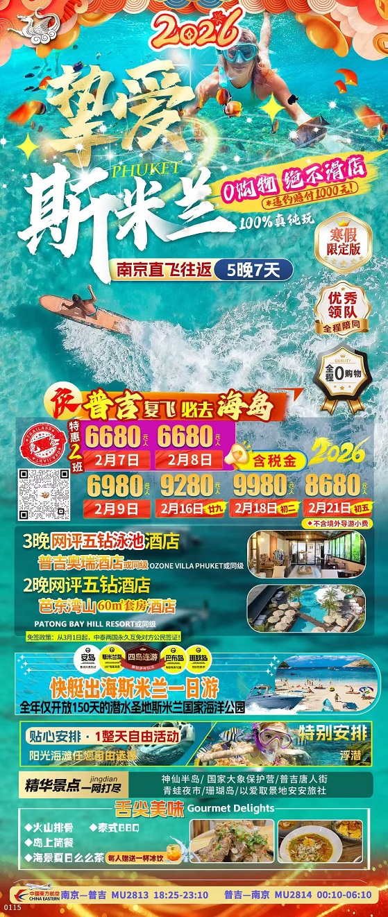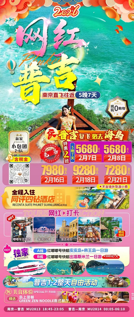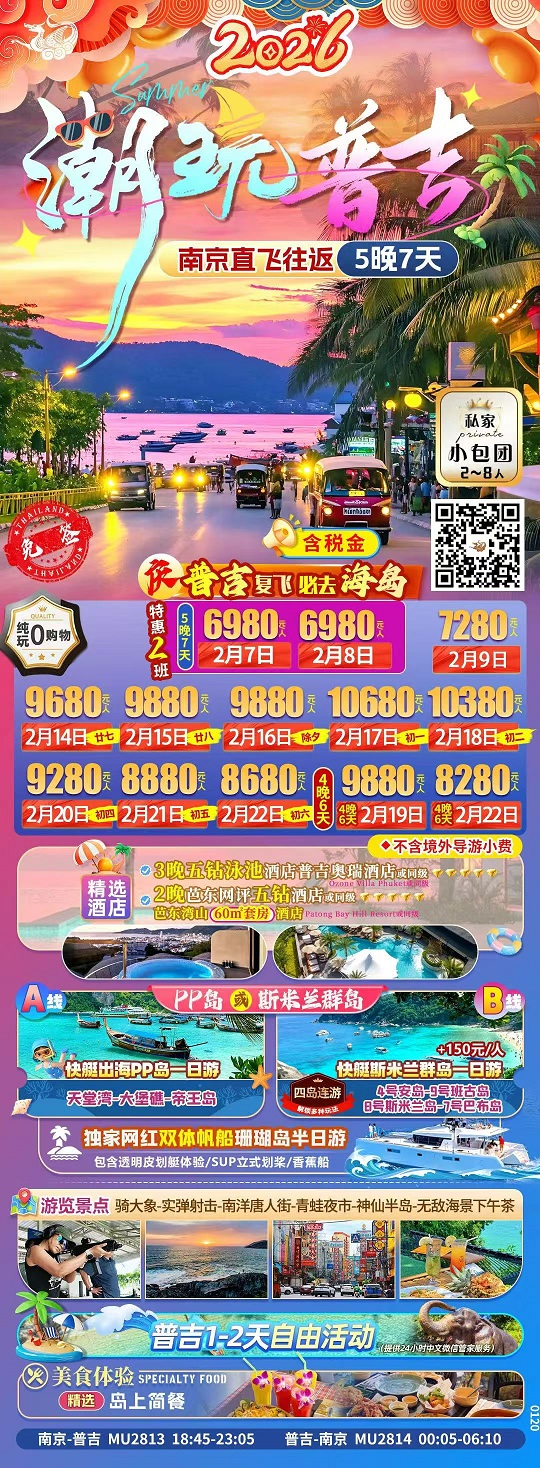 > 春节【泰国普吉岛-南京直飞】1月29日-2月27日报价