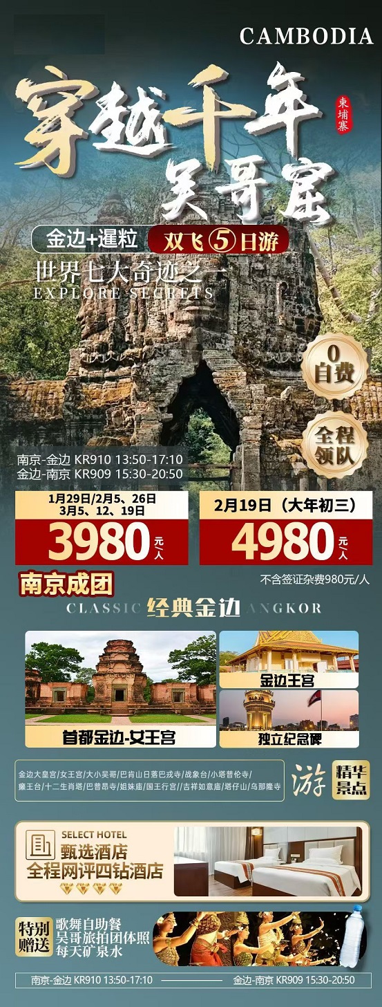 > 1-3月含春节【柬埔寨 南京包机直飞】线路及报价