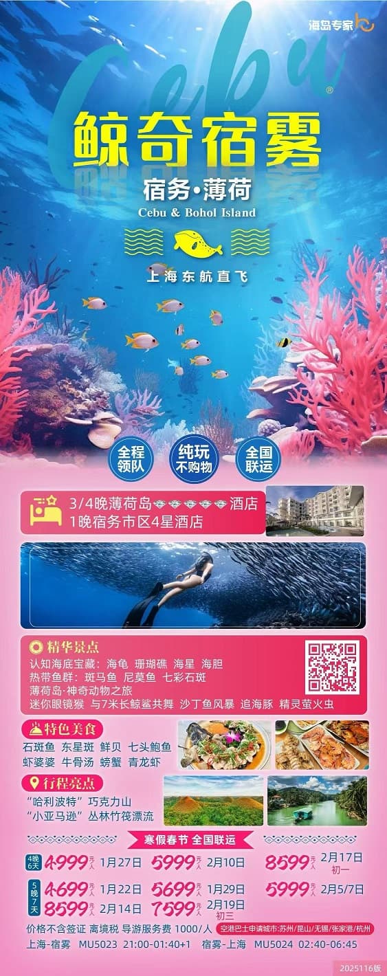 鲸奇宿雾-宿务薄荷岛4晚6天(MU直飞 1+3)