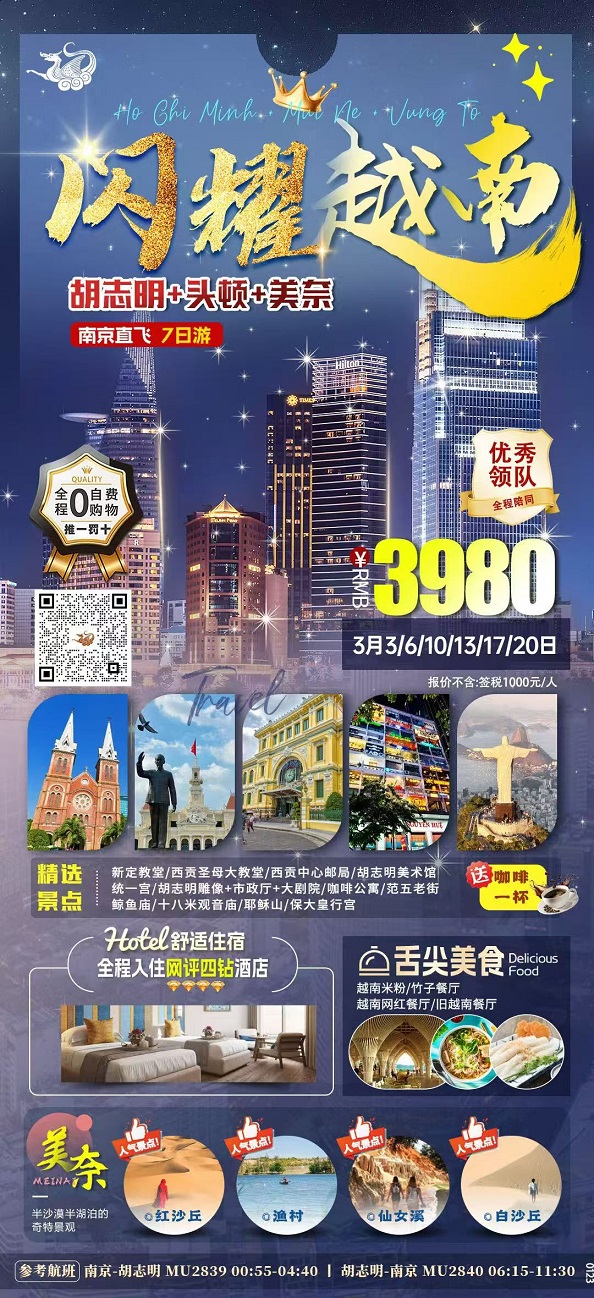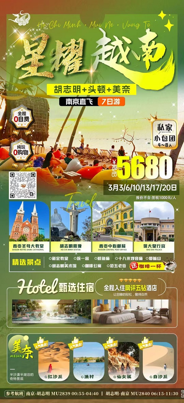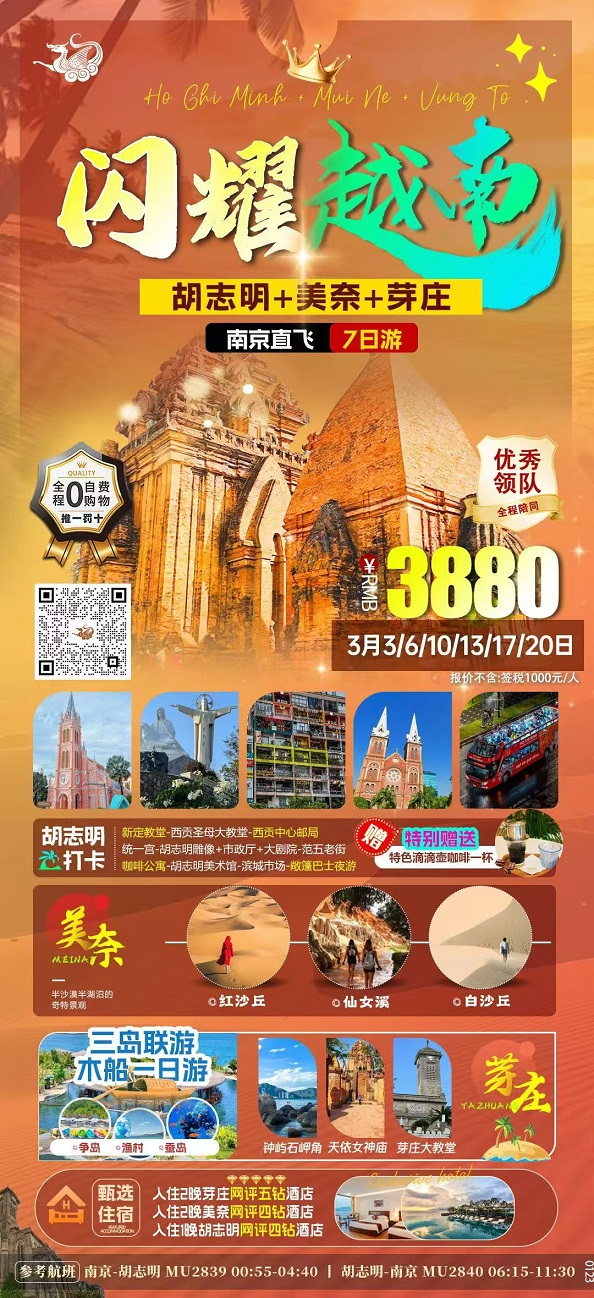 3月【越南:胡志明 美奈 头顿 芽庄 河内 南京直飞】线路报价