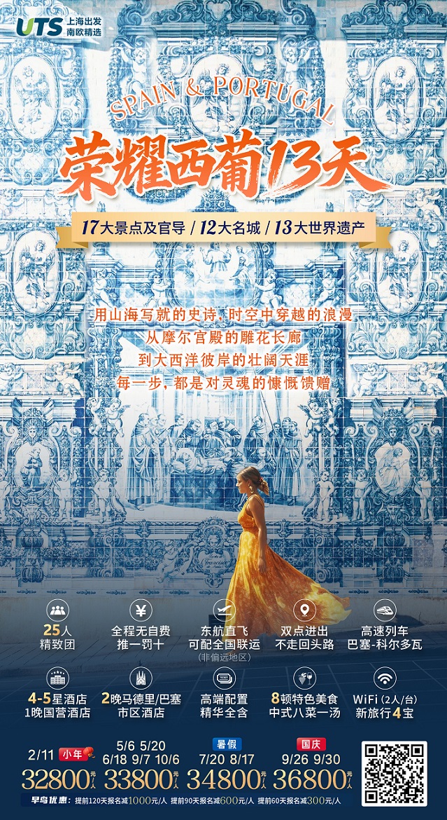 | 萨拉曼卡—约350公里—波尔图—约120公里—科英布拉 萨拉曼卡:世界文化遗产城市,西班牙黄金之城。到处是古迹,透着古老沧桑;因闻名世界的大学古城,被称为“智慧之城”。 萨拉曼卡城市观光(含官导,以下内容合计约1小时): 萨拉曼卡大学(外观):十九世纪由萨拉曼卡侯爵建造,建立于1218年,其悠久的历史和学术声望可与牛津大学和巴黎大学等学府相提并论。 波尔图:葡萄牙北部一个面向大西洋的港口城市。是葡萄牙第一大港和第二大城市。 波尔图城市观光(含官导,以下内容合计约1小时): 杜罗河(远眺):是伊比利亚半岛上的一条主要河流。发源于西班牙索里亚省,自东向西,最终在葡萄牙波尔图南约3公里处注入大西洋。 自由广场:位于下城的圣伊尔德丰索堂区。我们可以在广场中央竖立着的佩德罗四世骑马雕像下留下您的美丽风情。漫步于广场北侧建成现代化的同盟大道、市政厅广场。 波尔图大教堂(外观):座落于波尔图显眼的丘陵之上,是这座城市古老的古迹之一。教堂整体建筑结构呈现为哥特式与巴洛克式的混合的风格。 牧师塔(外观):波尔图的标志性建筑,是典型的巴洛克式塔楼。 莱罗兄弟书店(外观):被誉为十大最美书店之一,其新哥特式的外观和楼梯皆由建筑师埃斯特韦斯设计建造。 【波特酒酒窖+品酒】*(约1小时):在杜罗河谷 (Vale do Douro) 被认定为世界遗产的那片壮阔的原野上,人类酿造出了高品质的波特酒和佐餐葡萄酒,波特酒是葡萄牙最古老的形象大使。参观生产葡萄酒的酒庄,并安排品酒活动。 科英布拉(以下内容合计约30分钟):作为葡萄牙曾经的首都,一座将古老历史、学术氛围与艺术魅力融为一体的城市,是葡萄牙不可或缺的文化心脏。 科英布拉大学(外观)科英布拉大学创建于 1290 年,是葡萄牙古老的大学,是伊比利亚半岛上历史悠久的高等学府。2013 年被评为世界文化遗产。 | ||||